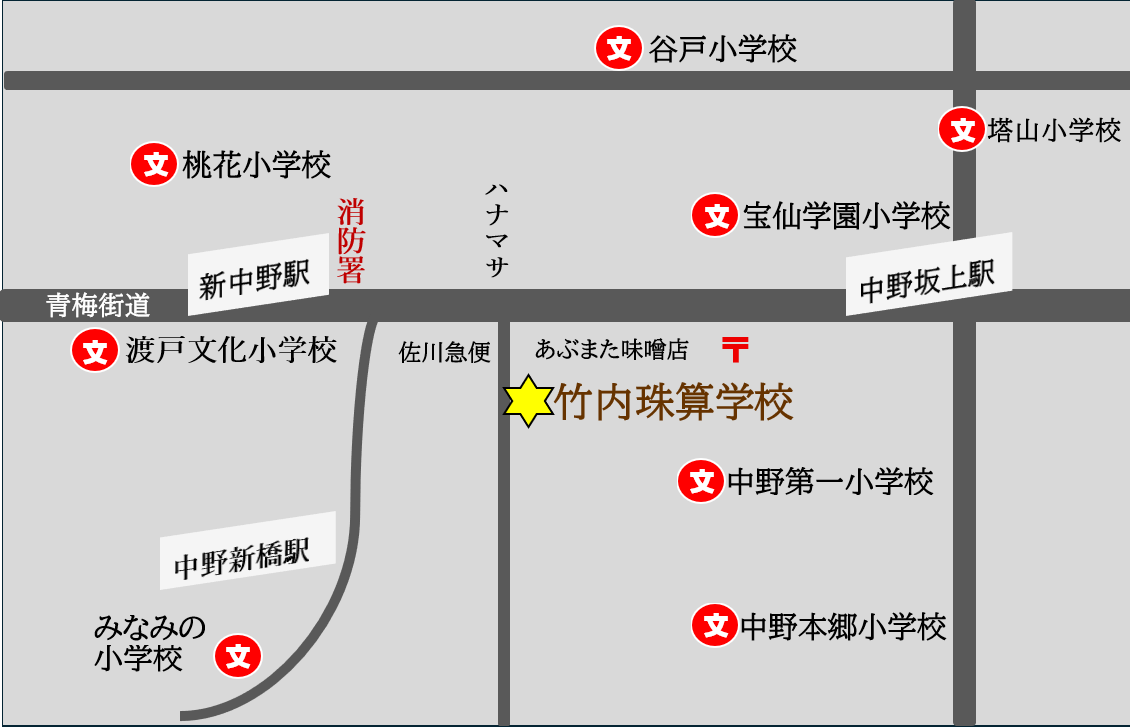 アクセス 丸の内線 新中野駅 新宿方面出口から徒歩8分 都バス 本町三丁目駅(あぶまた味噌店裏)徒歩3分 ・自転車通学可能 概要 生前私の父(早大専商学科卒)の話です。中野区で開校した際、当時そろばん界で著名な竹内乙彦先生から学び【竹内】という看板をいただいた由来があります。教室名にはその厚意をこめております。 創立 1954年4月1日 講師 内川清子・久子