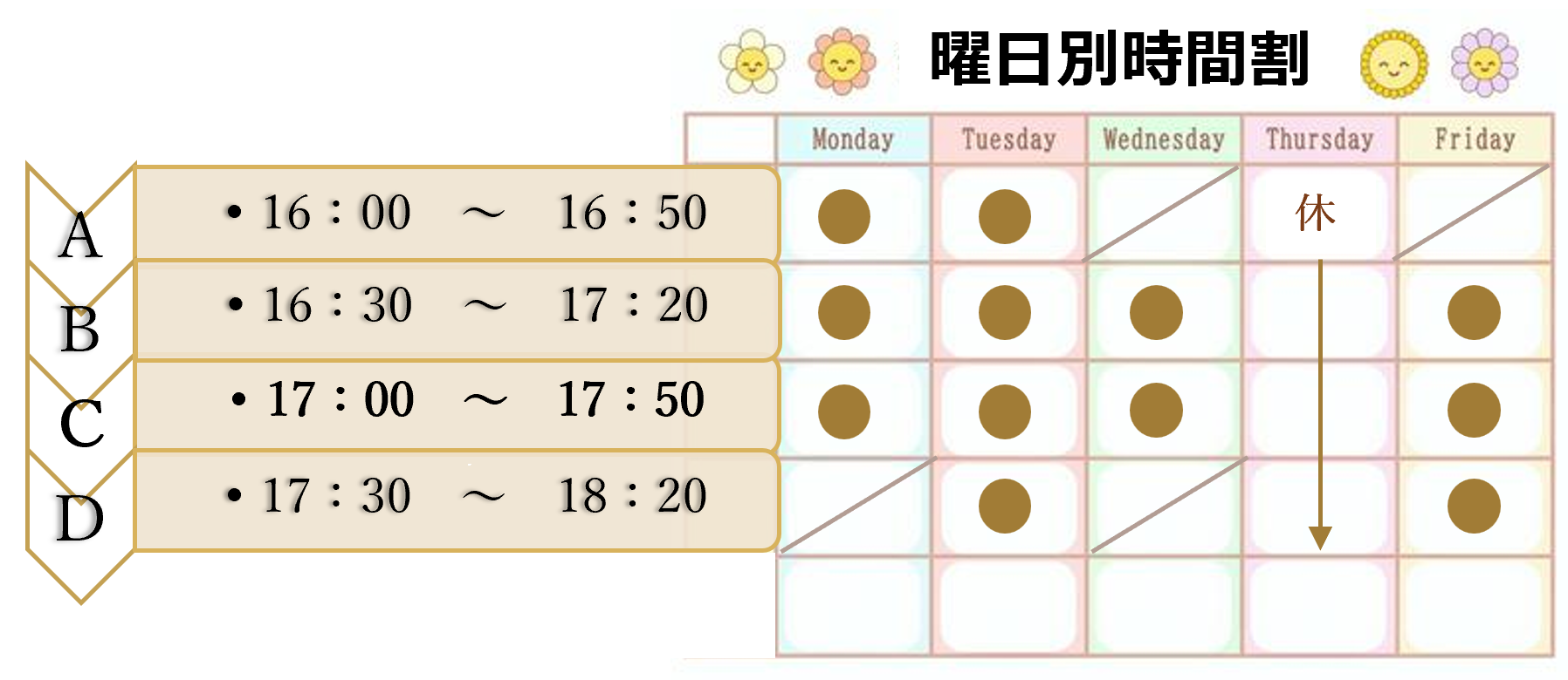 入学対象 小学校1年生~(幼稚園年中・年長は要相談) レッスン日 週4日(月・火・水・金) 祝日除く 入学金 ¥8,000- (生徒手帳・初回ドリル3冊・ペンケース一式) レッスン料(月額)1週1回 ¥7,000~ 指定日祝日の場合 振替可能です ※ その他詳細は 体験レッスンのお時間にご説明いたします